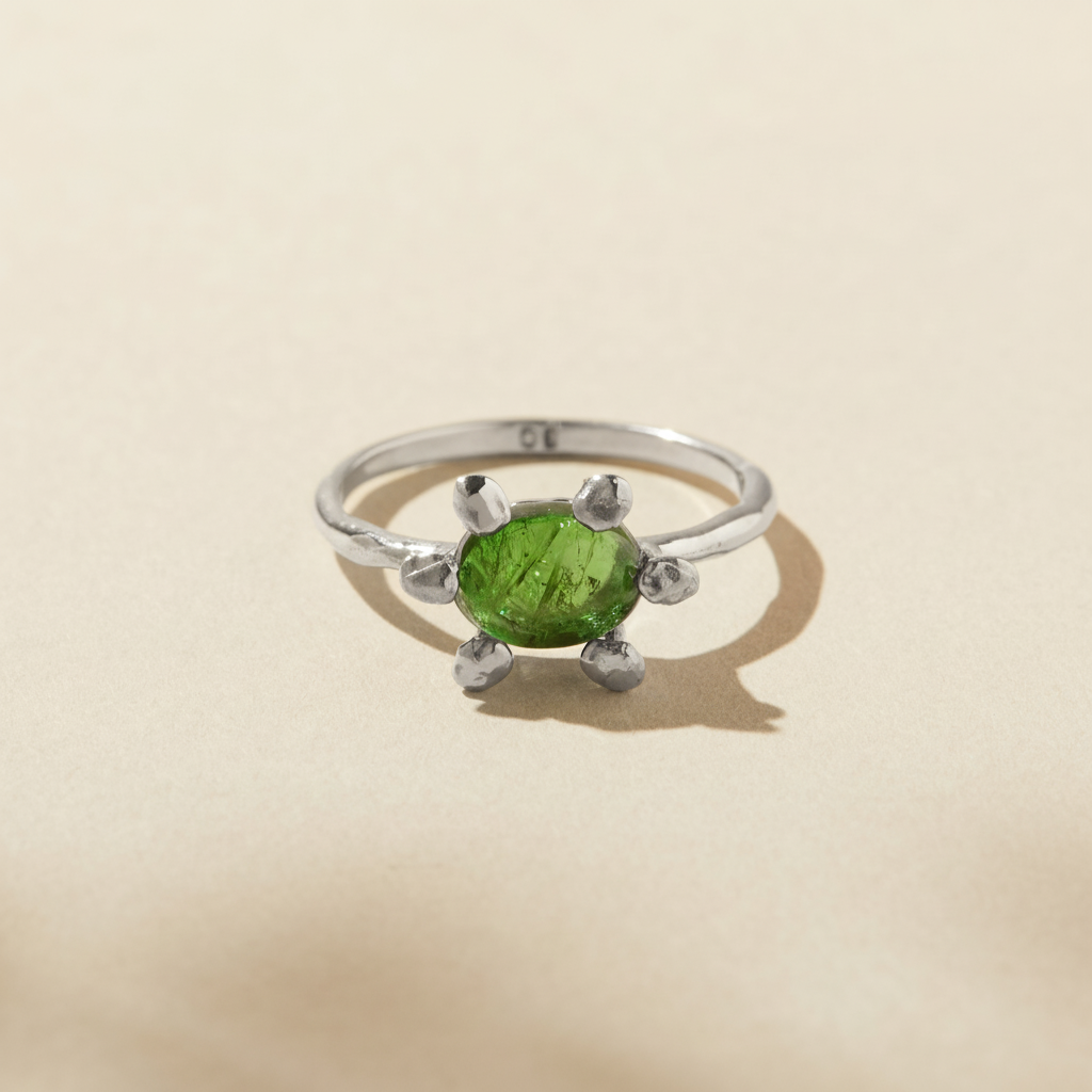 Aster Ring with natural Green Tourmaline cabochon in shiny silver finish