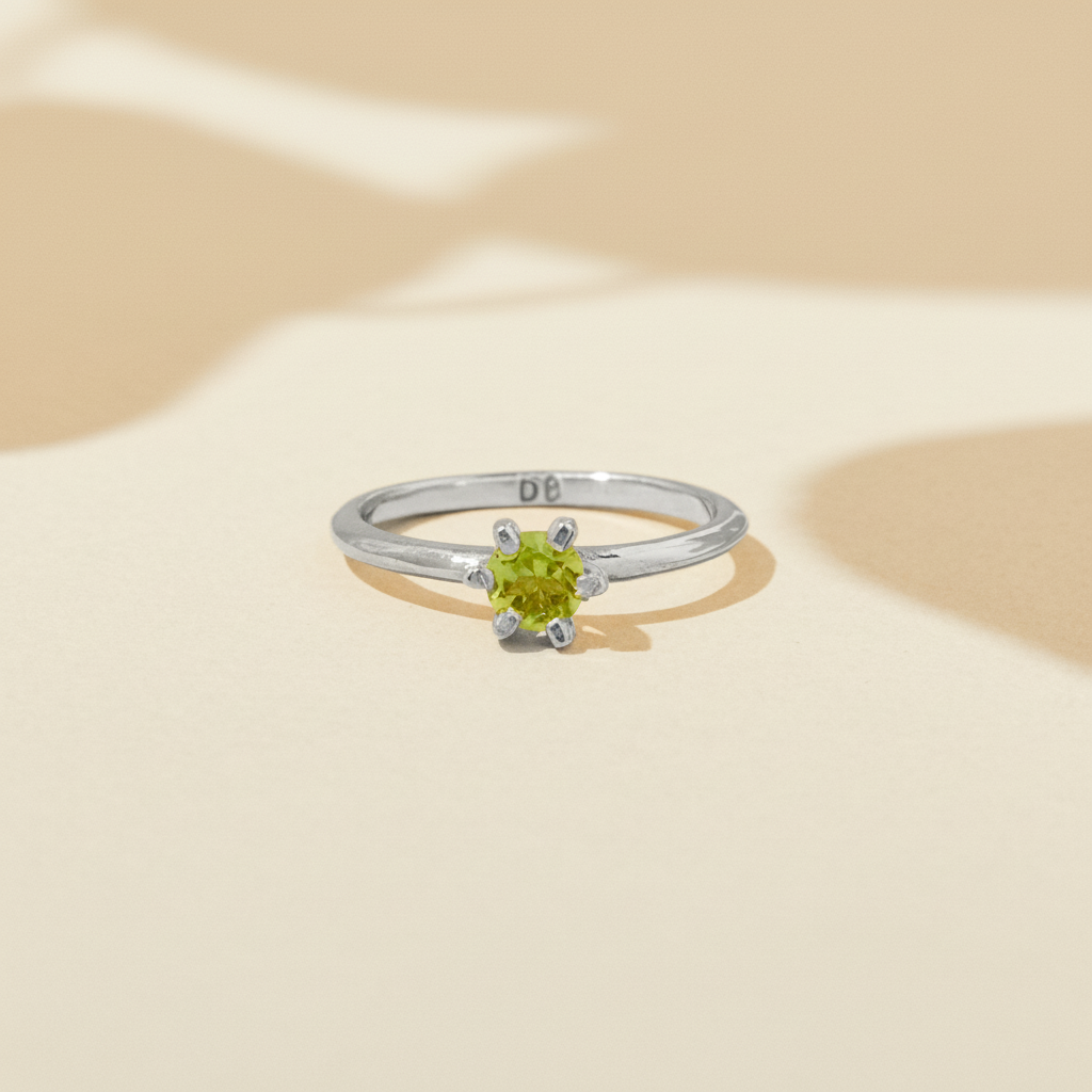 Set in either 14k gold, bright yellow bronze or sterling silver, Peridot, with its greenish-yellow coloring and hints of earthy tone has been prized since the Age of Egyptians. It is associated with creativity, balance, and harmony. Our Birthstone Ring is adorned with a genuine gemstone and cradled by 14k gold, bright yellow bronze, or sterling silver. Each one is supported by prongs resembling flower petals in bloom. Stack it, admire it, wear it daily. Your ring is more than an accessory: it is an heirloom of honor to anchor your days. Let it remind you of your roots that lead the way.