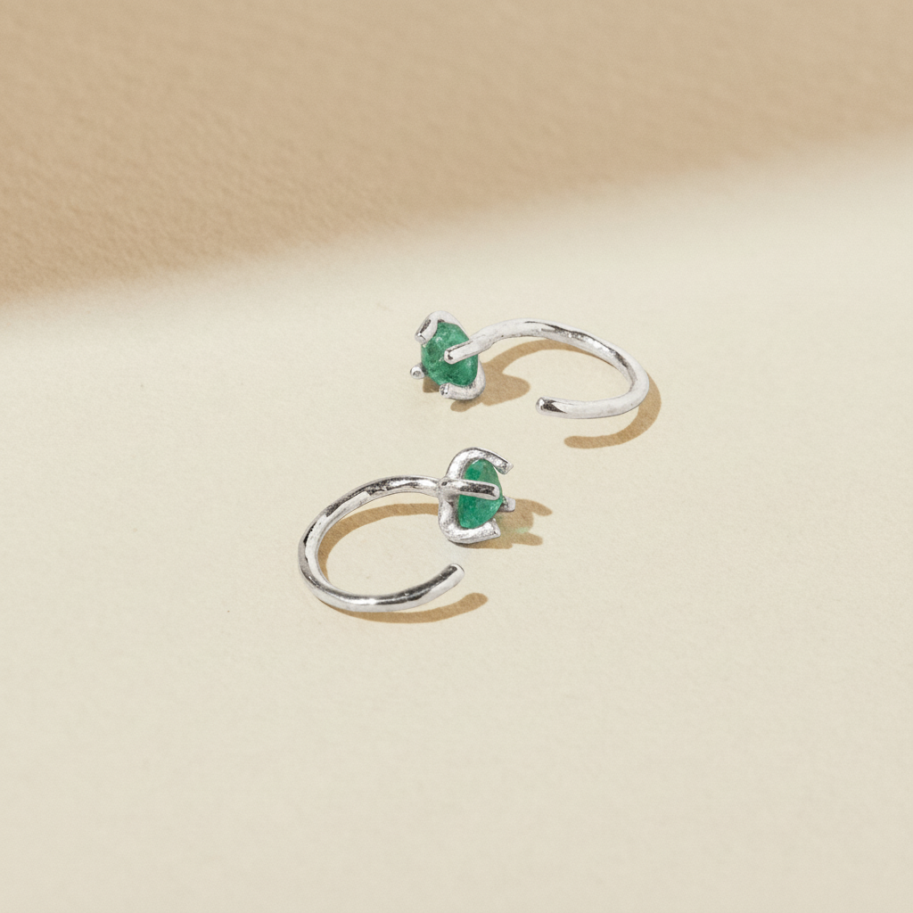 Those outfit-elevating, mood-boosting, go-with-everything winners. Bold and handcrafted in recycled 14k solid gold, bright yellow bronze or sterling silver, these emerald gemstone hugger earrings will upgrade your jewelry stack, elevate brain power, and inspire you to lead with truth. Go ahead and take up space. An open huggie hoop that curves under the earlobe, these are delicate enough to wear in a second or third piercing. Pair it, wear alone, rock them daily.