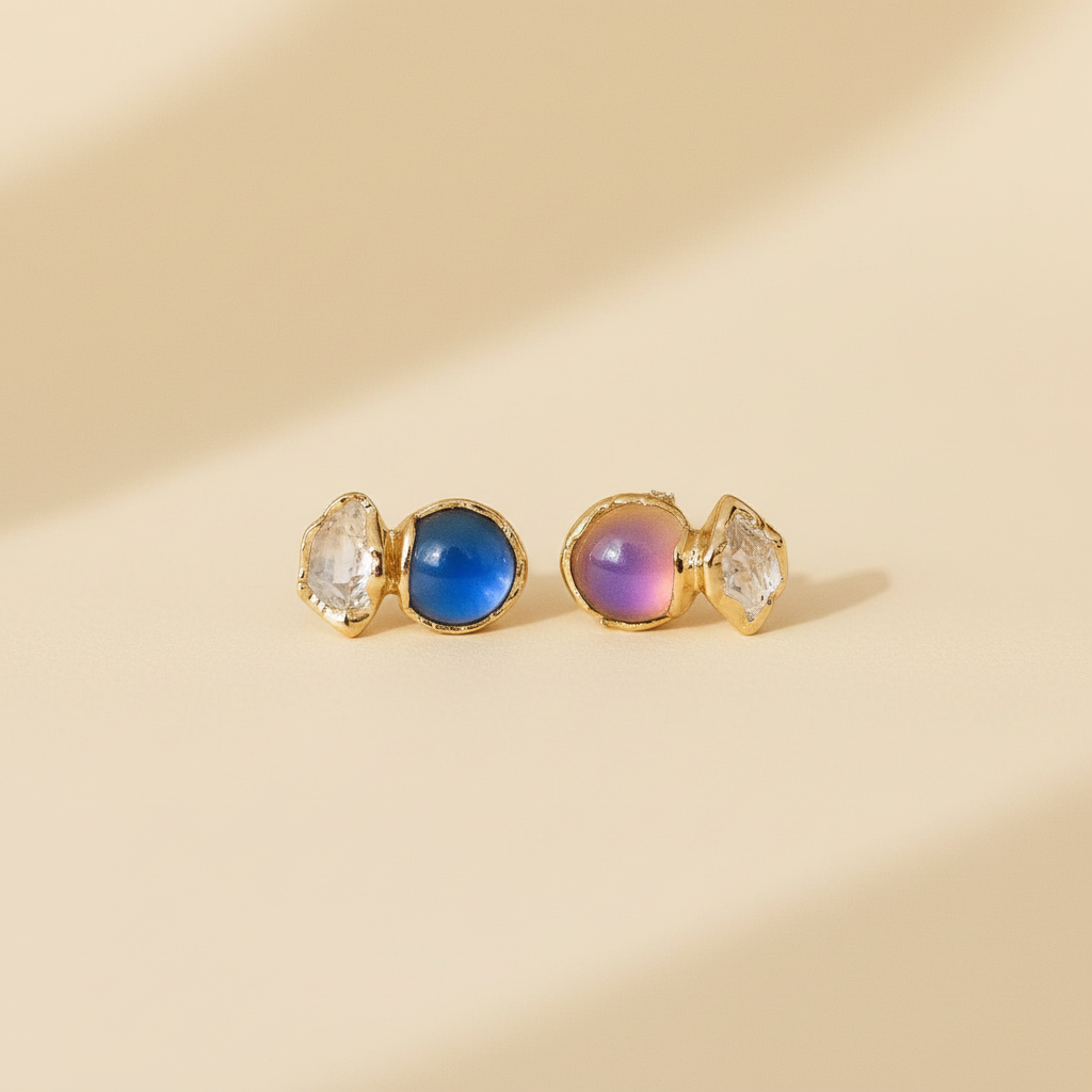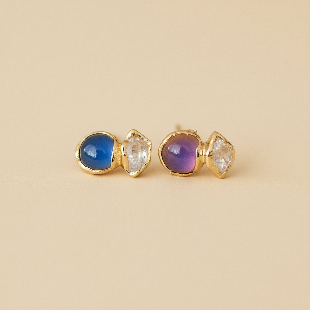 Crafted from an authentic 1970s mood stone in pristine condition, these post-style earrings accent your face with color magic. Adding visual interest along with heightened good vibes, a Herkimer diamond crystal nestles beside each stone, all set into a brilliant 14-karat gold plate setting.