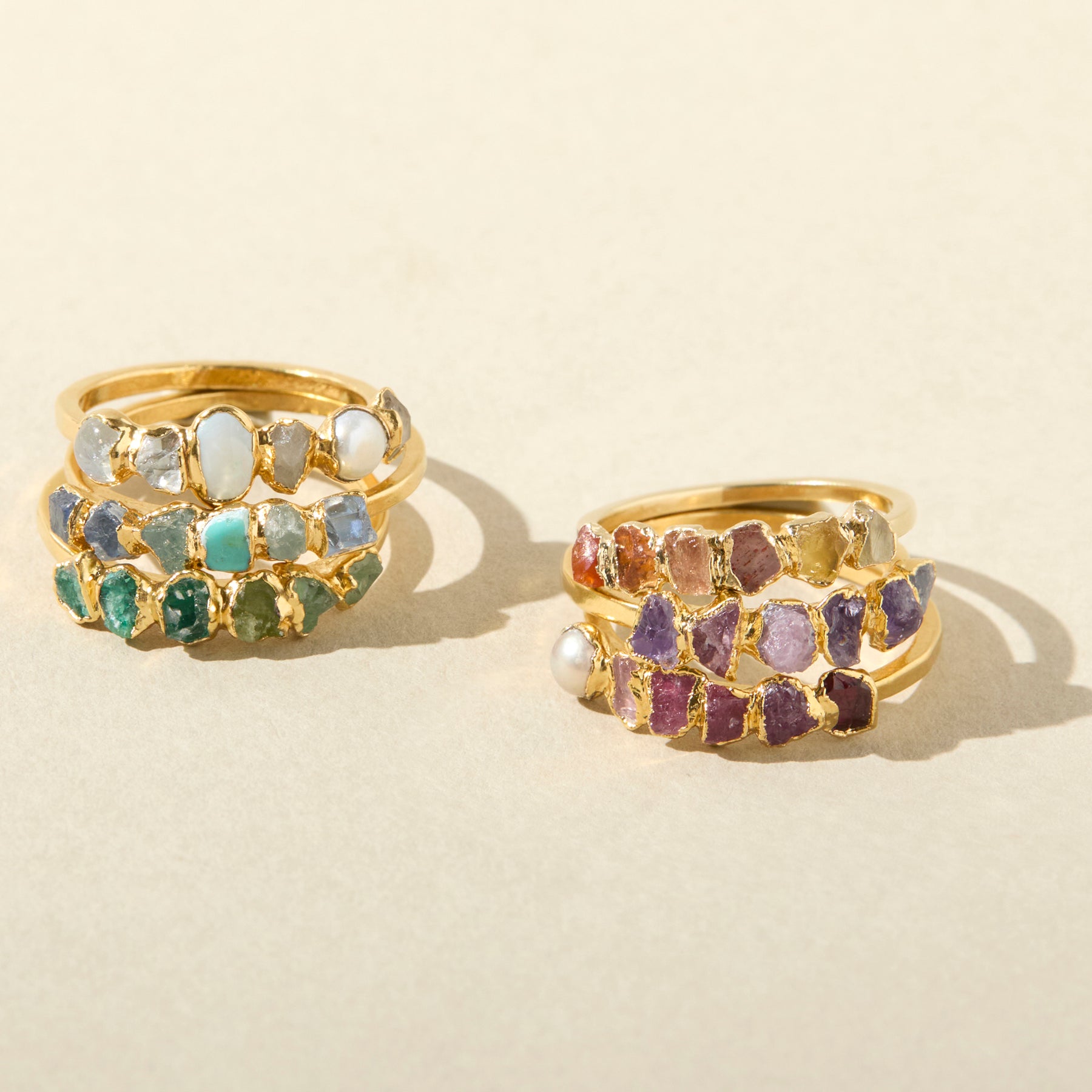 Featuring raw garnet, ruby, pink tourmaline, spinel, morganite, and pink pearl stones, the pink ombré birthstone ring has birthstones for January, July, October, August and June. From dusky garnet to pale pink pearl, she has it all (just like you). Pink stones are said to bring out your inner lover, empowering you to unleash affection and let go of fear. Garnet offers deep regenerative powers, so your spirit is renewed with each successive wear.