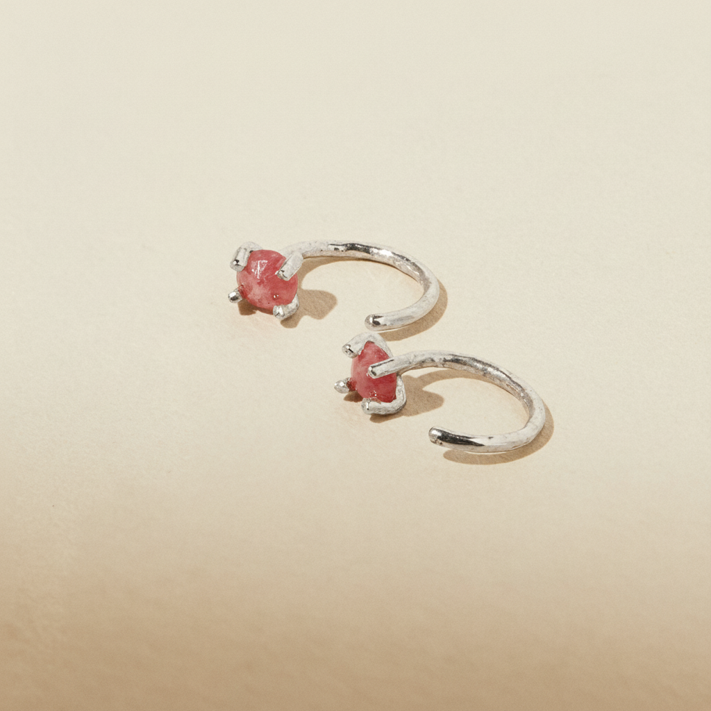 Those outfit-elevating, mood-boosting, go-with-everything winners. Bold and handcrafted in recycled 14k solid gold, bright yellow bronze or sterling silver, these ruby gemstone hugger earrings will upgrade your jewelry stack, ramp up your passion, and bring about a radiant glow. An open huggie hoop that curves under the earlobe, these are delicate enough to wear in a second or third piercing. Pair it, wear alone, rock them daily.