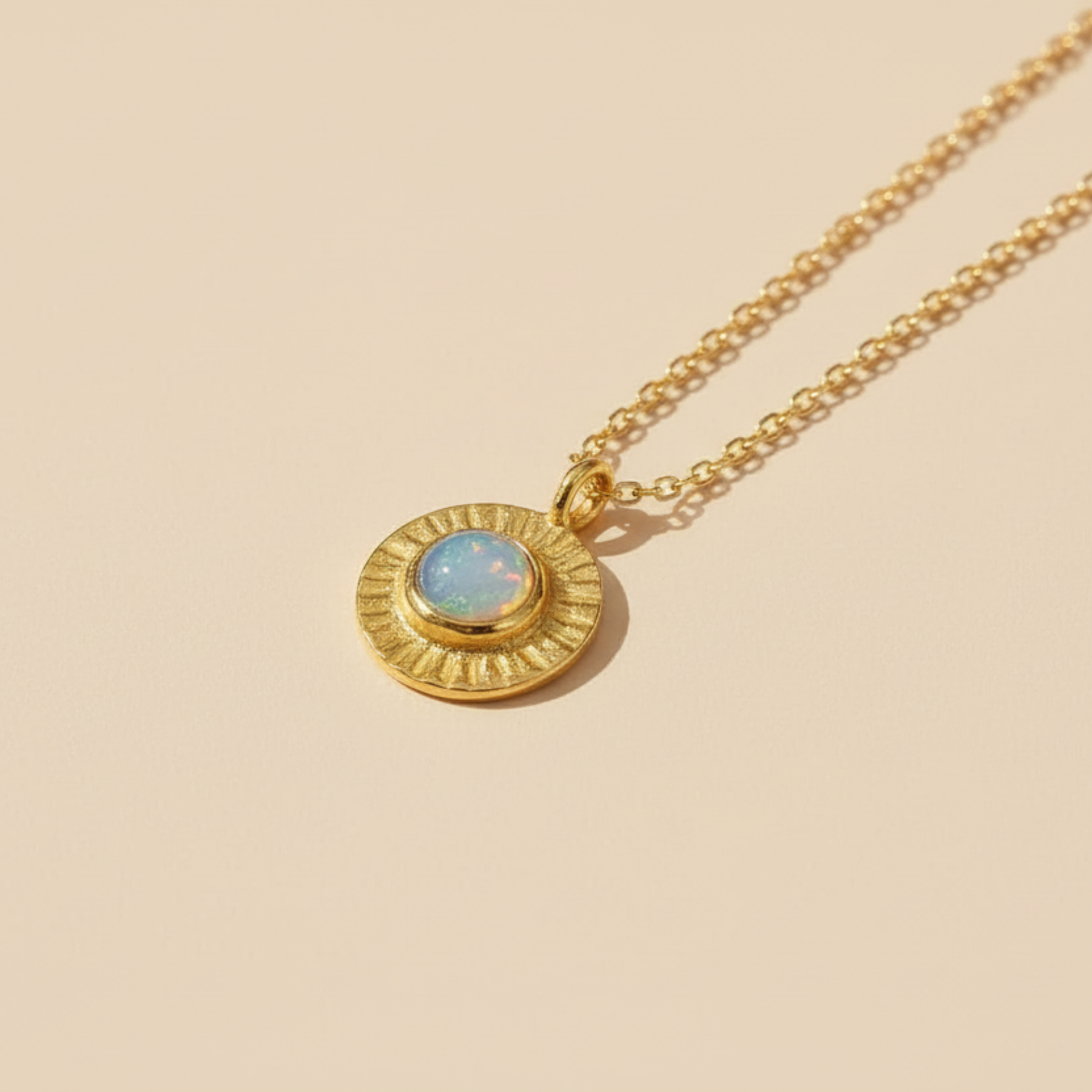 Small but mighty, the Opal Coin Necklace is crafted from 18k gold vermeil with etched lines that give it a textured, lived-in feel. At the center, a fiery opal adds a burst of color and creative energy. Bold and simple, this piece feels a little like an impromptu road trip. Unexpected, full of possibility, and always ready to take you somewhere new.