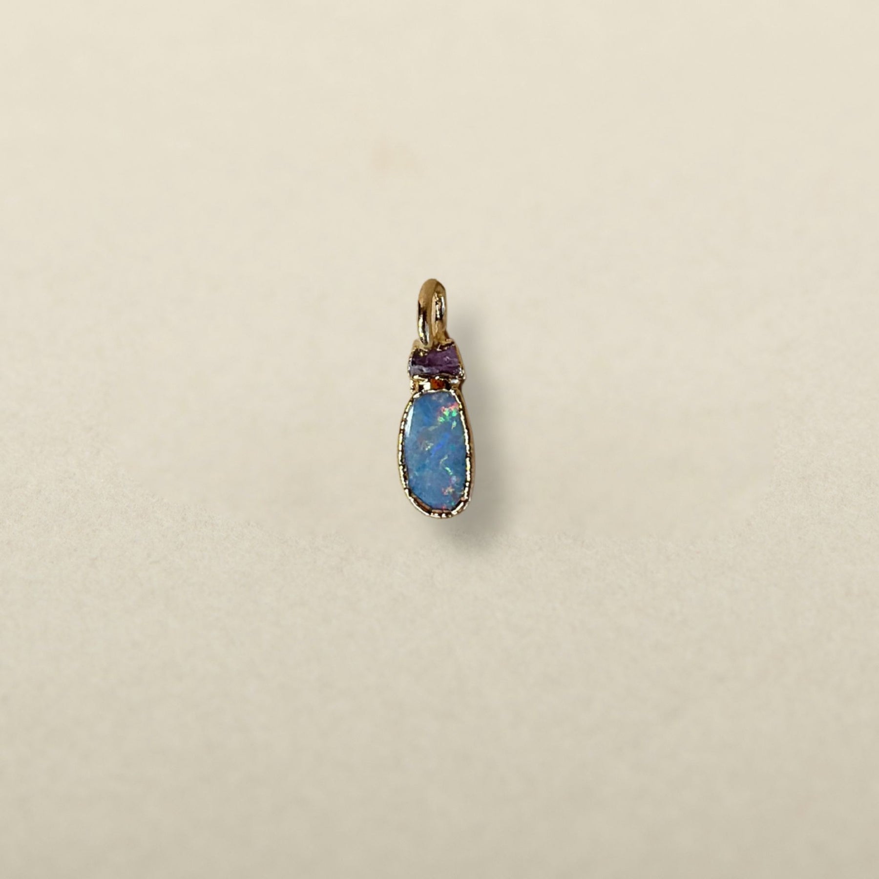A soft pink Rose de France crystal sits above a natural boulder opal from a women-run mine in Australia. The pairing feels delicate and luminous, with the pinkish lavender stone catching the light and the opal flashing wild painterly color. Hints of blue, green, gold, and rose move across the surface, giving it that unmistakable shimmering fire opal is known for.