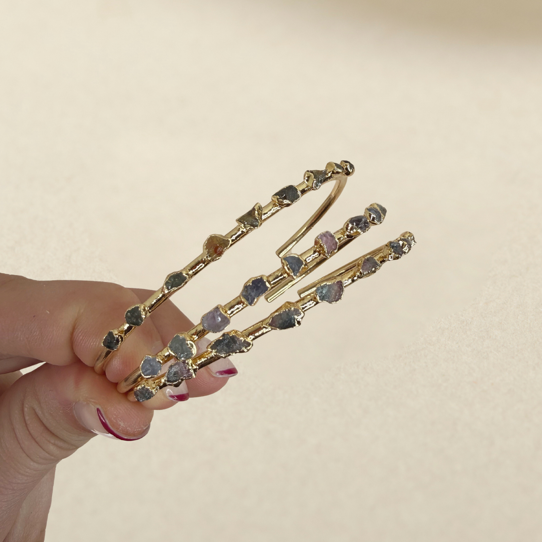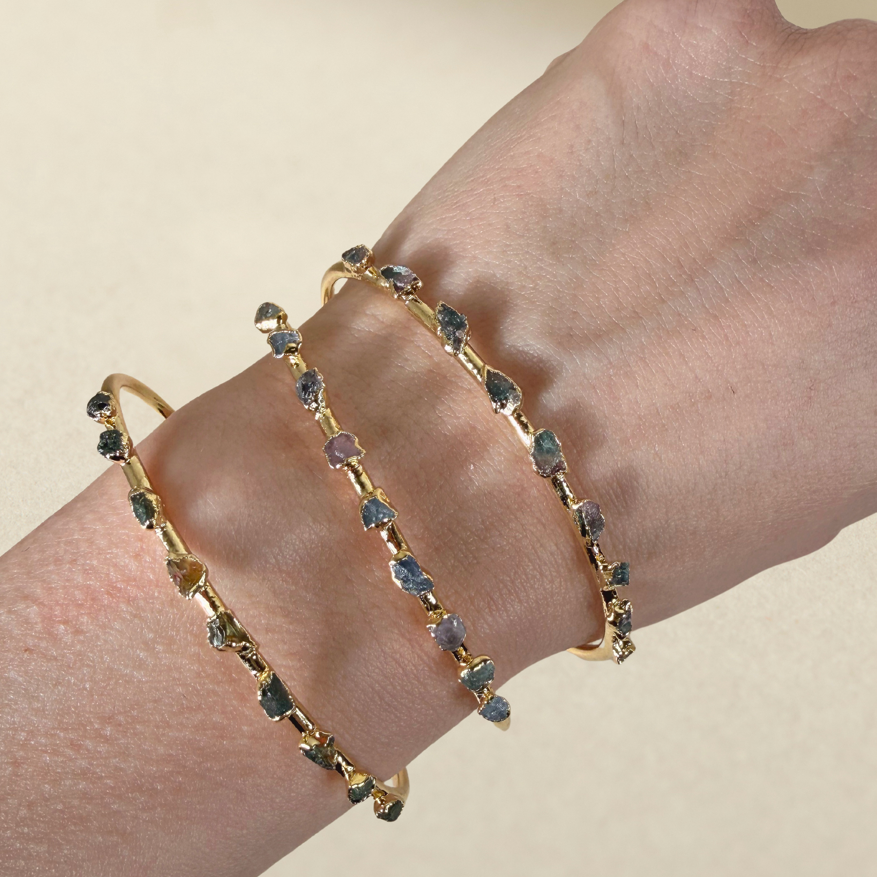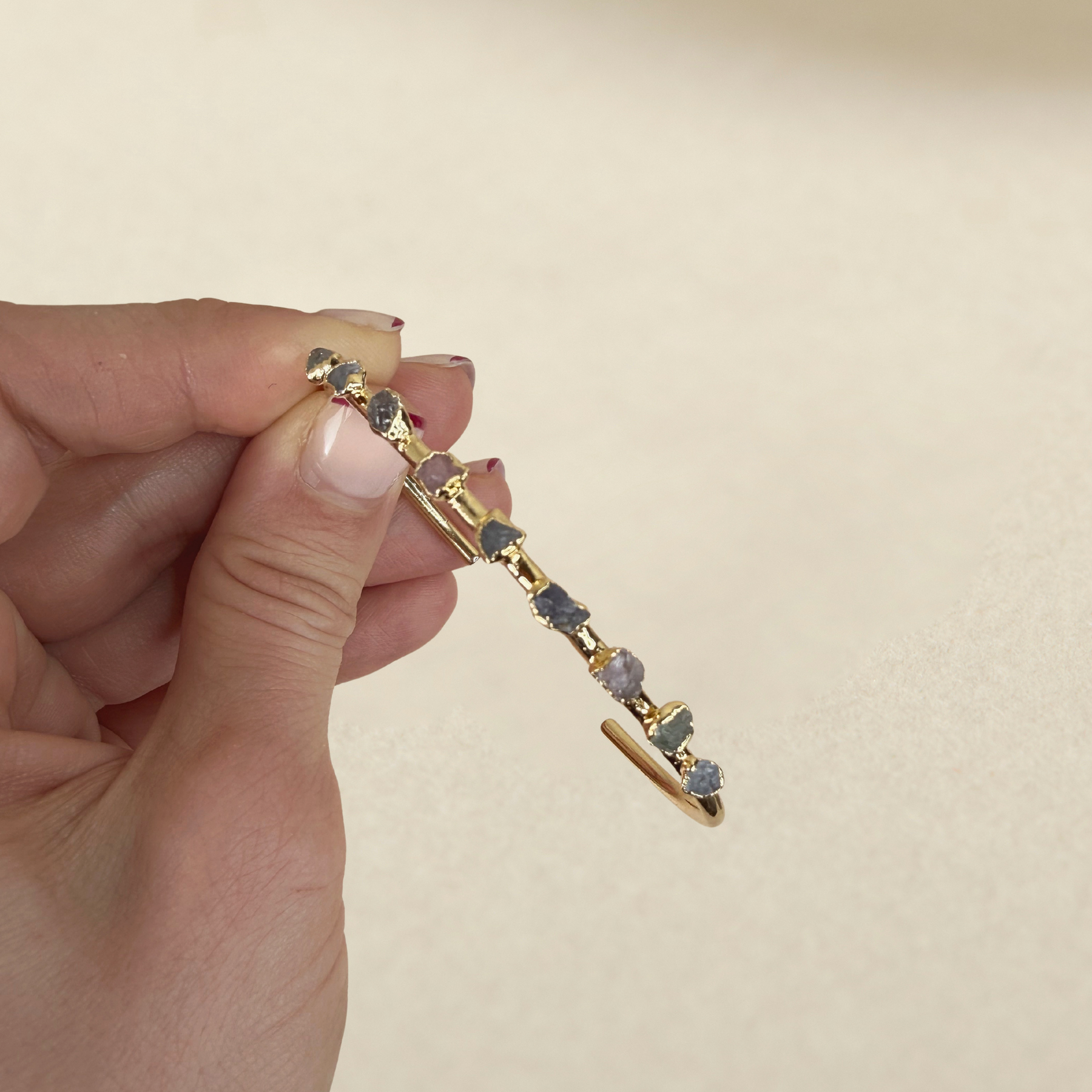 Soft hues and a wash of dreamy color. This cuff features raw sapphires in pale pink, lavender, and sky blue. The effect is delicate and romantic, like watercolor brushstrokes catching the light. A sweet, feminine piece that brightens every stack.