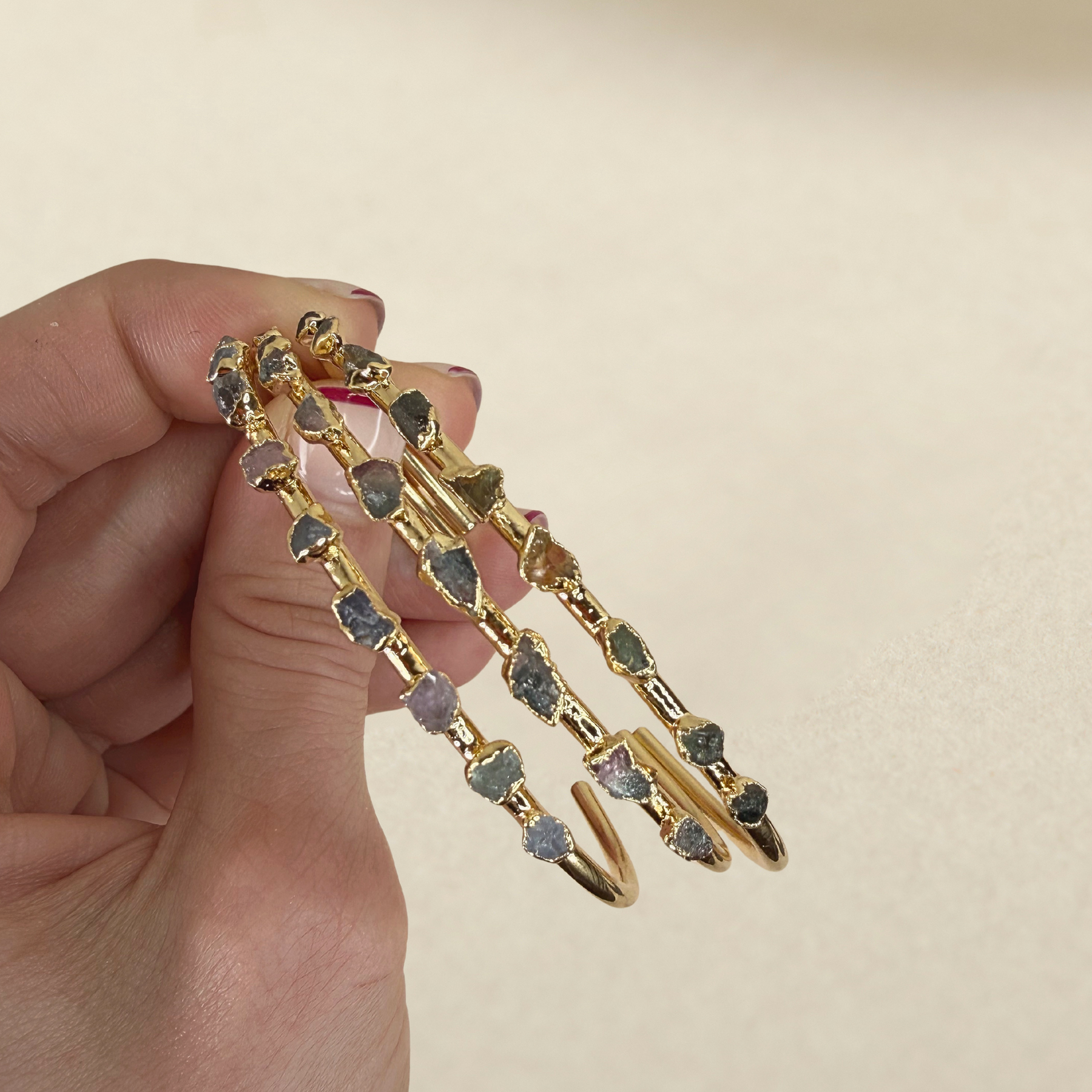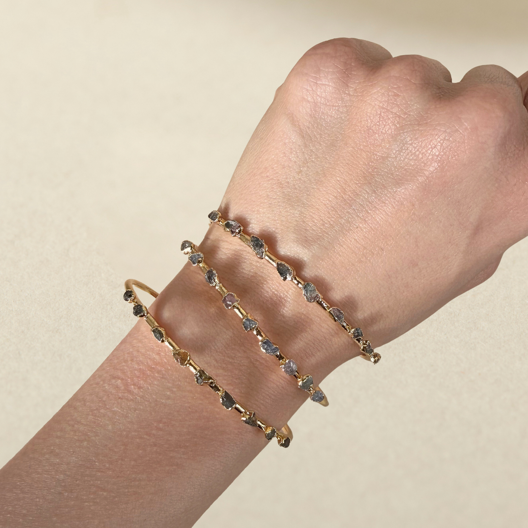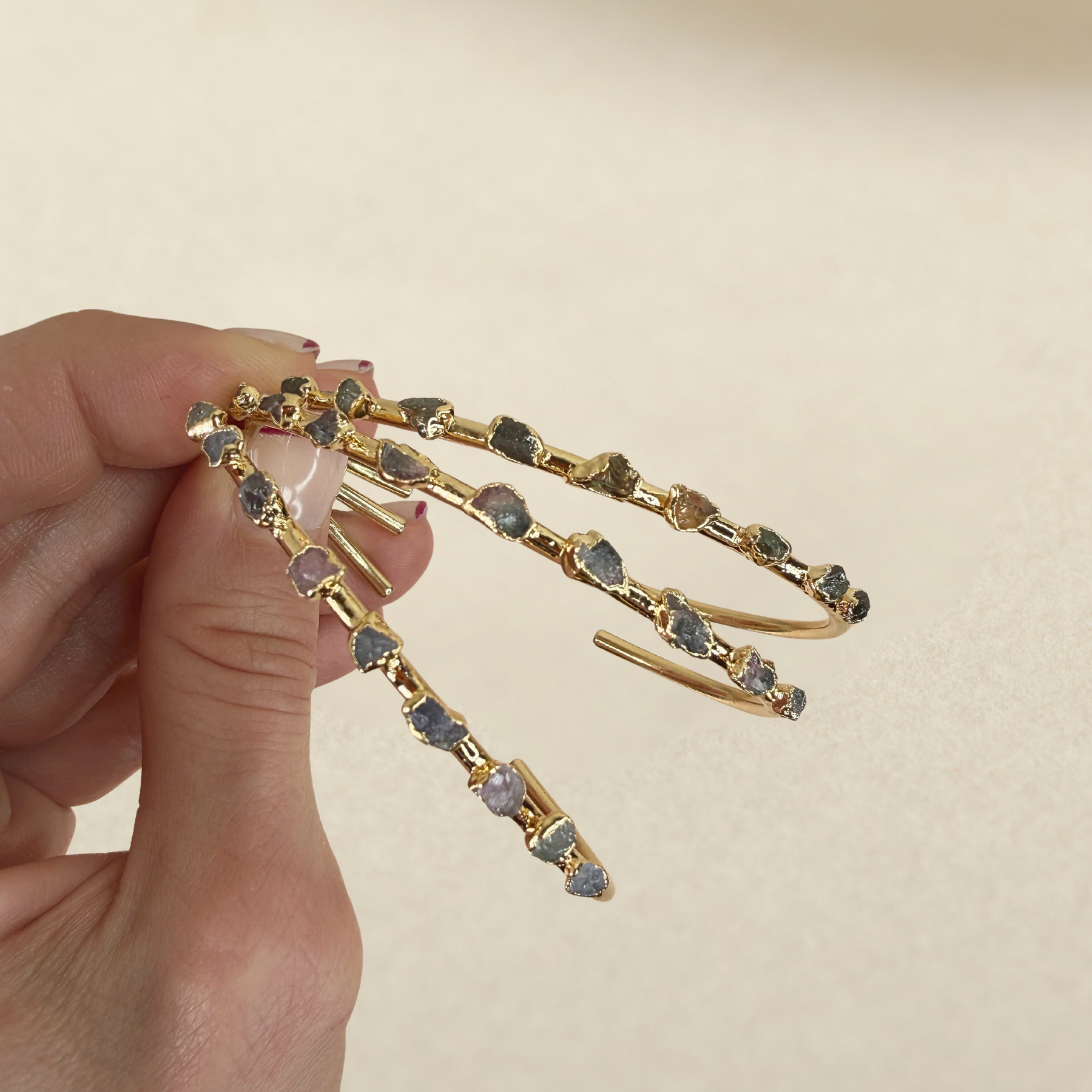 Soft hues and a wash of dreamy color. This cuff features raw sapphires in pale pink, lavender, and sky blue. The effect is delicate and romantic, like watercolor brushstrokes catching the light. A sweet, feminine piece that brightens every stack.